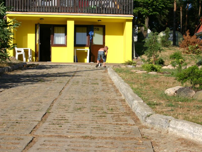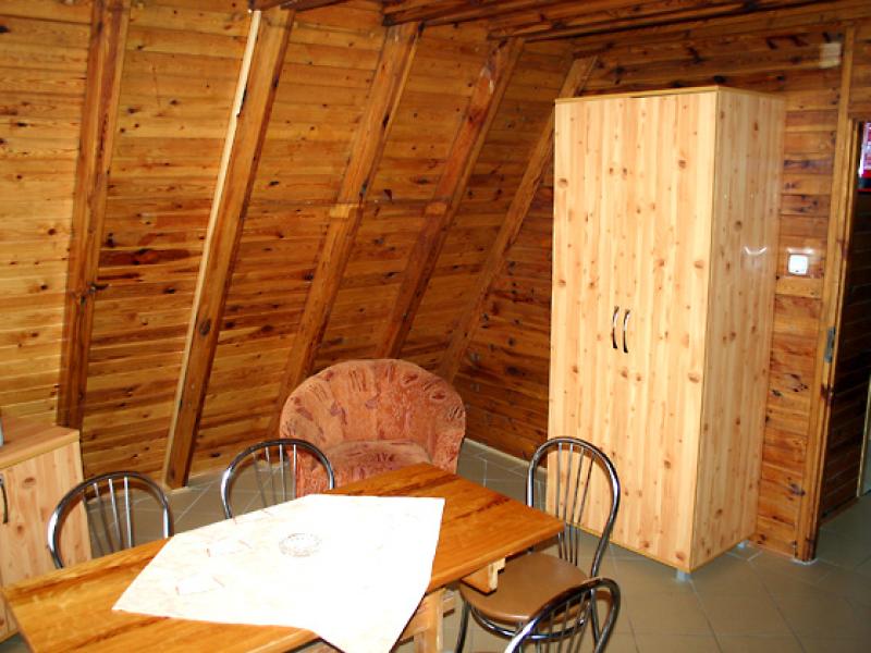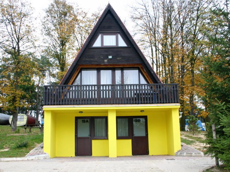 • Domkach campingowych typu Brda 6 osobowych. Domek jest dwukondygnacyjny na parterze znajduje się łazienka, kuchnia, pokój dzienny z wersalką dwuosobową oraz taras. Na piętrze znajdują się dwie sypialnie, w każdym dwa łóżka pojedyncze. Jedna sypialnia jest przechodnia a druga jest zamykana. Kuchnia wyposażona jest w kuchenkę dwupalnikową, czajnik, lodówkę, naczynia. Powierzchnia domku ok. 50 m2 Galeria domków BRDA